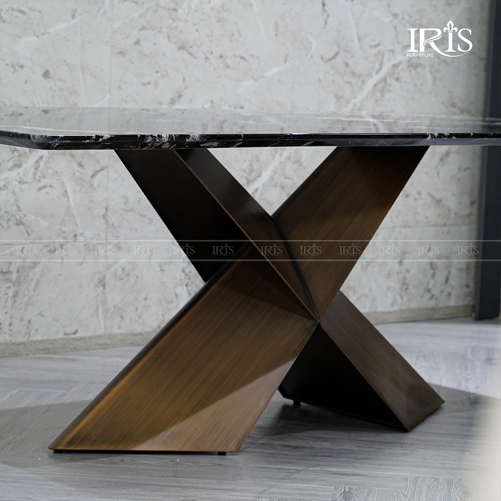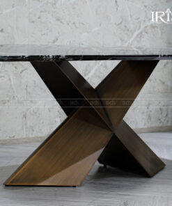 Chân bàn được chế tác theo thiết kế chữ X uốn lượn mềm mại, phủ đồng ánh kim sang trọng. Đây là điểm nhấn giúp: