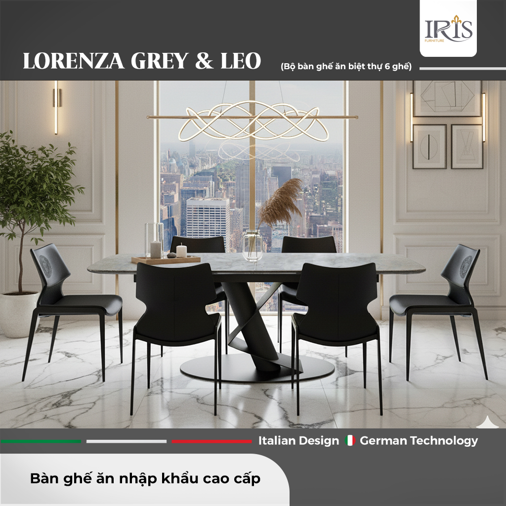 Sự giao thoa giữa mặt đá Ceramic Ý của bàn Lorenza Grey và chất liệu da cao cấp của ghế Leo mang đến tổng thể hài hòa, đồng bộ và cực kỳ sang trọng.