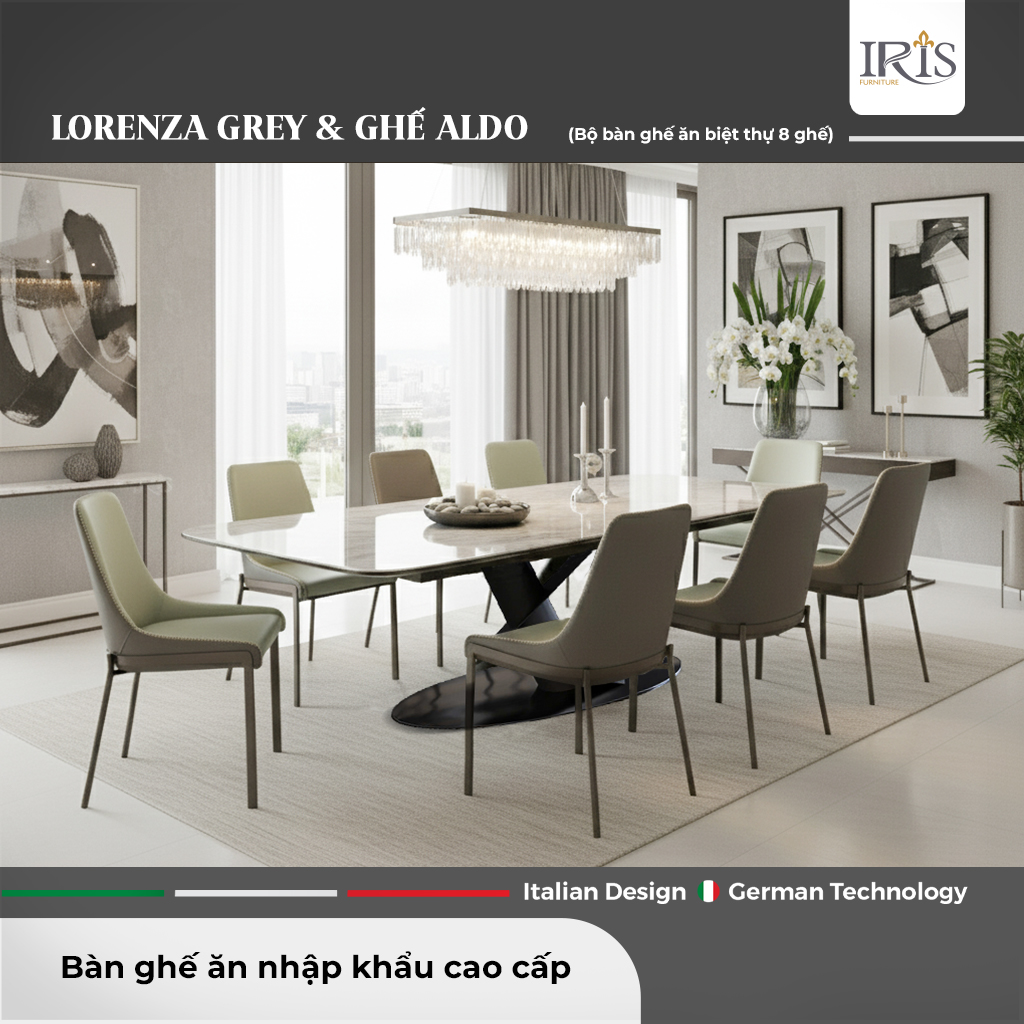 Hãy biến phòng ăn của bạn trở nên sang trọng và tiện nghi với bộ bàn ăn Lorenza Grey kèm 8 ghế da Aldo. Tại Nội Thất IRIS, chúng tôi cam kết mang đến những sản phẩm chất lượng cao, thiết kế tinh tế và dịch vụ tận tâm, từ tư vấn, giao hàng đến lắp đặt. Đừng bỏ lỡ cơ hội nâng tầm không gian sống của bạn – liên hệ ngay với IRIS để sở hữu bộ bàn ghế hoàn hảo cho gia đình bạn!