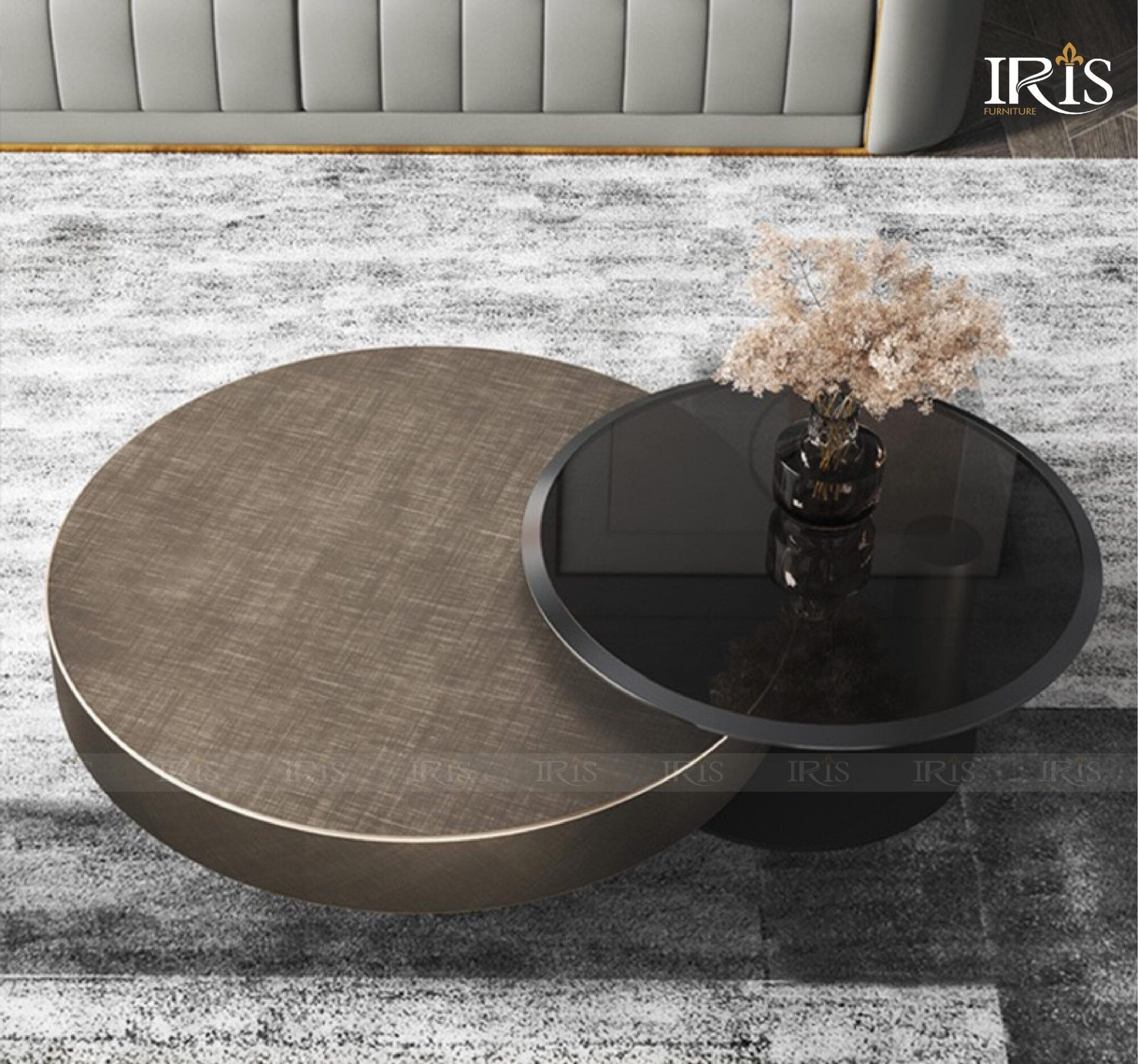 Bộ bàn trà Louis hiện đang bán tại showroom IRIS là combo gồm 2 món nội thất cao cấp: Bàn trà tròn Inox mạ xước và bàn tab kính đen sang trọng.