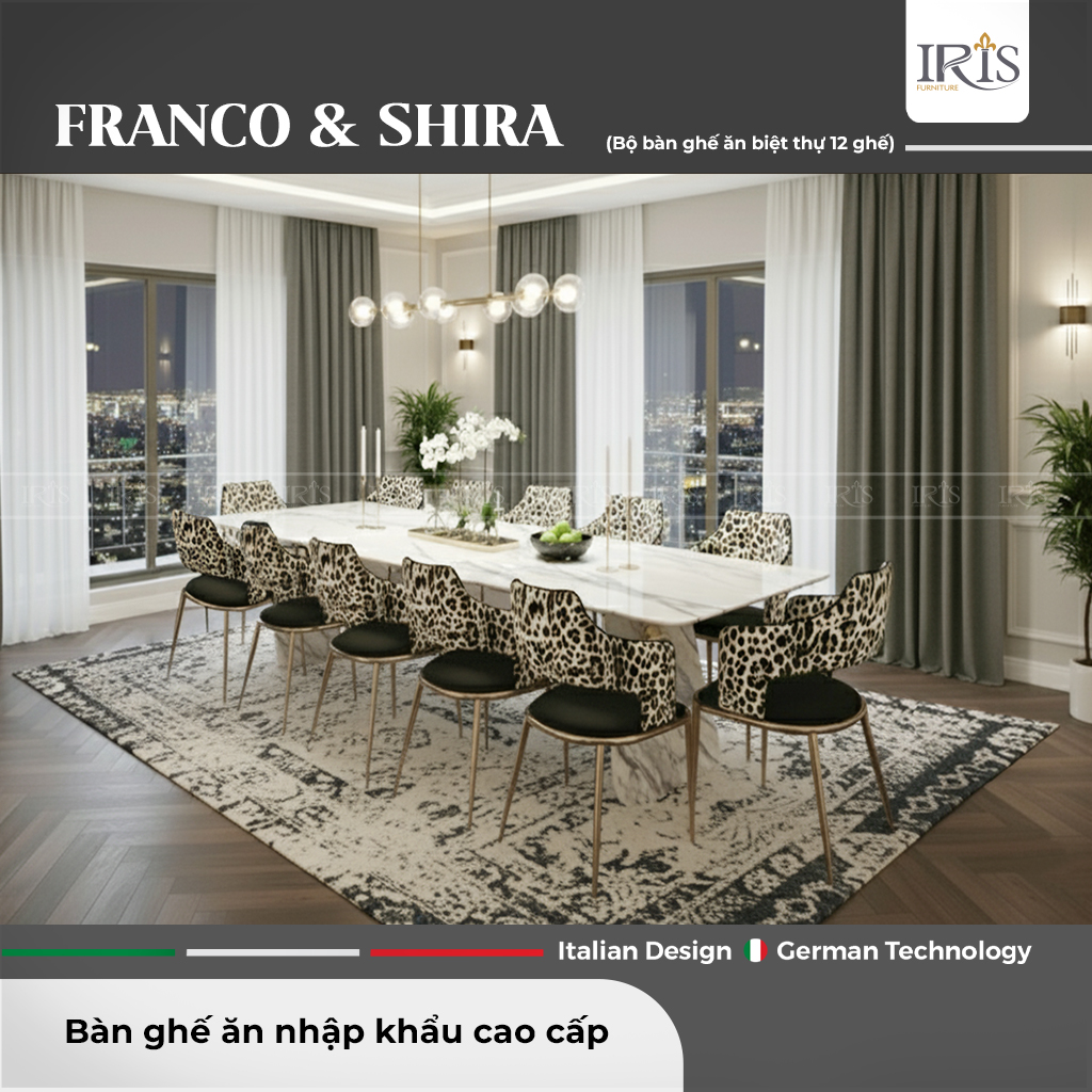 Bộ bàn ăn Franco & ghế Shira mang đến sự kết hợp hoàn hảo giữa đá Marble tự nhiên quý hiếm và thiết kế Ý đẳng cấp. Mặt bàn nguyên khối sang trọng phối cùng dáng ghế thanh mảnh, quyến rũ tạo nên không gian phòng ăn đầy tinh tế. Chất liệu cao cấp, độ bền vượt trội và tính thẩm mỹ độc bản giúp bộ sản phẩm trở thành lựa chọn đúng đắn cho mọi căn hộ sang trọng. Một điểm nhấn hoàn mỹ dành cho gia chủ yêu phong cách châu Âu.